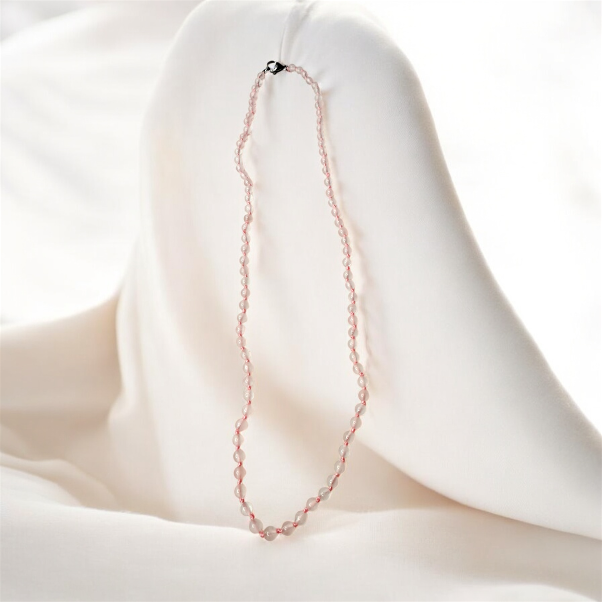 Este delicado collar de cuarzo rosa natural está elaborado con finas bolas de 4 mm, seleccionadas por su color rosado suave y su brillo sutil. Con una longitud fija de 50 cm, su diseño equilibrado aporta elegancia y una sensación de serenidad y calidez.