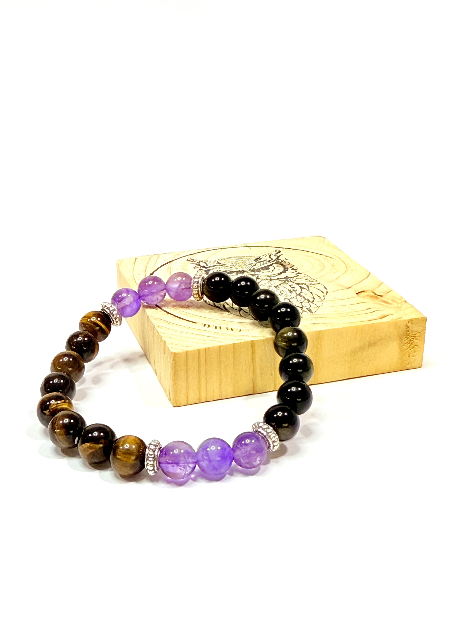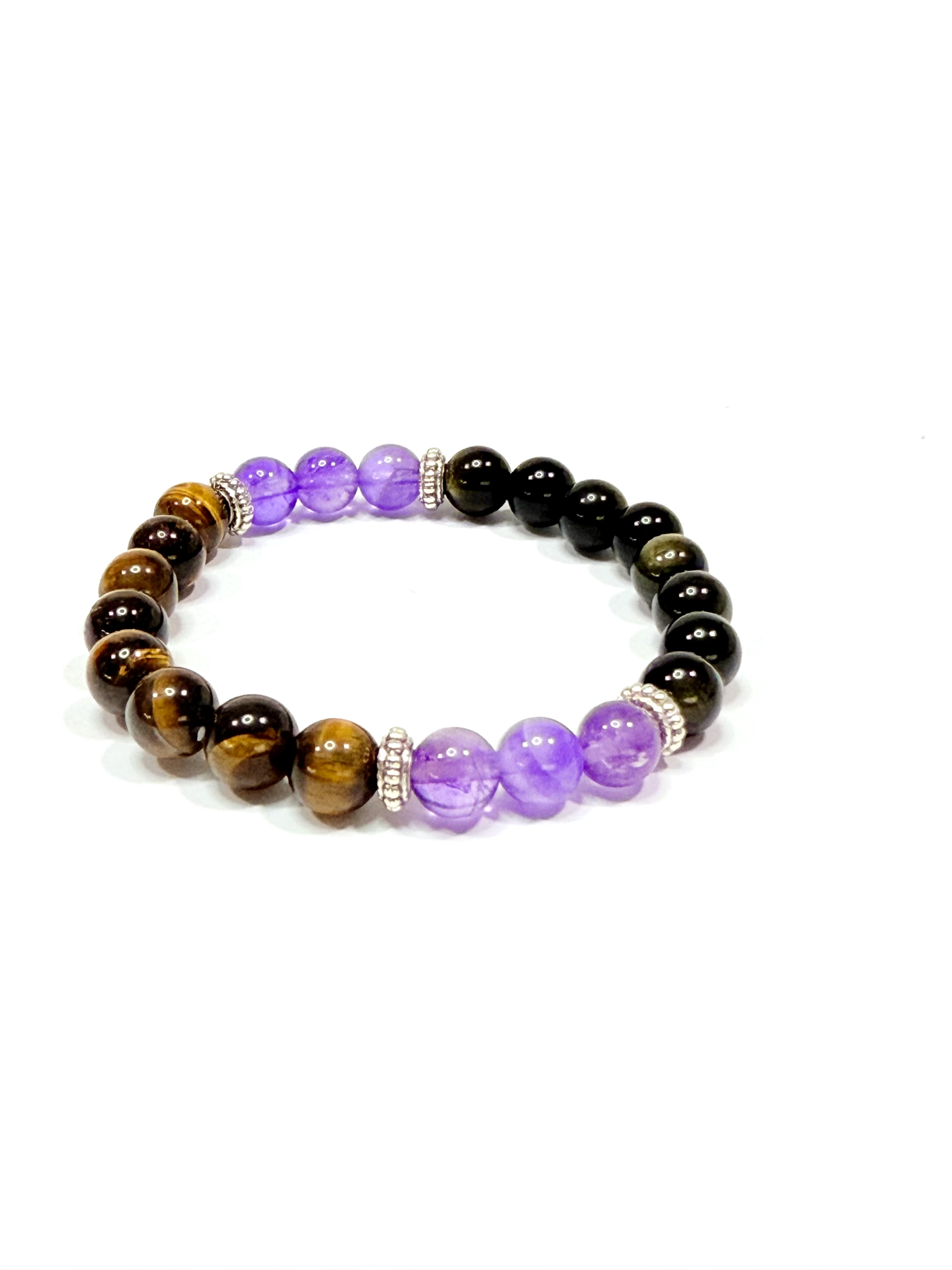 Una barrera espiritual poderosa. La Obsidiana repele la negatividad, el Ojo de Tigre refleja malas intenciones, y la Amatista purifica el aura y eleva tu vibración por encima de la envidia ajena.