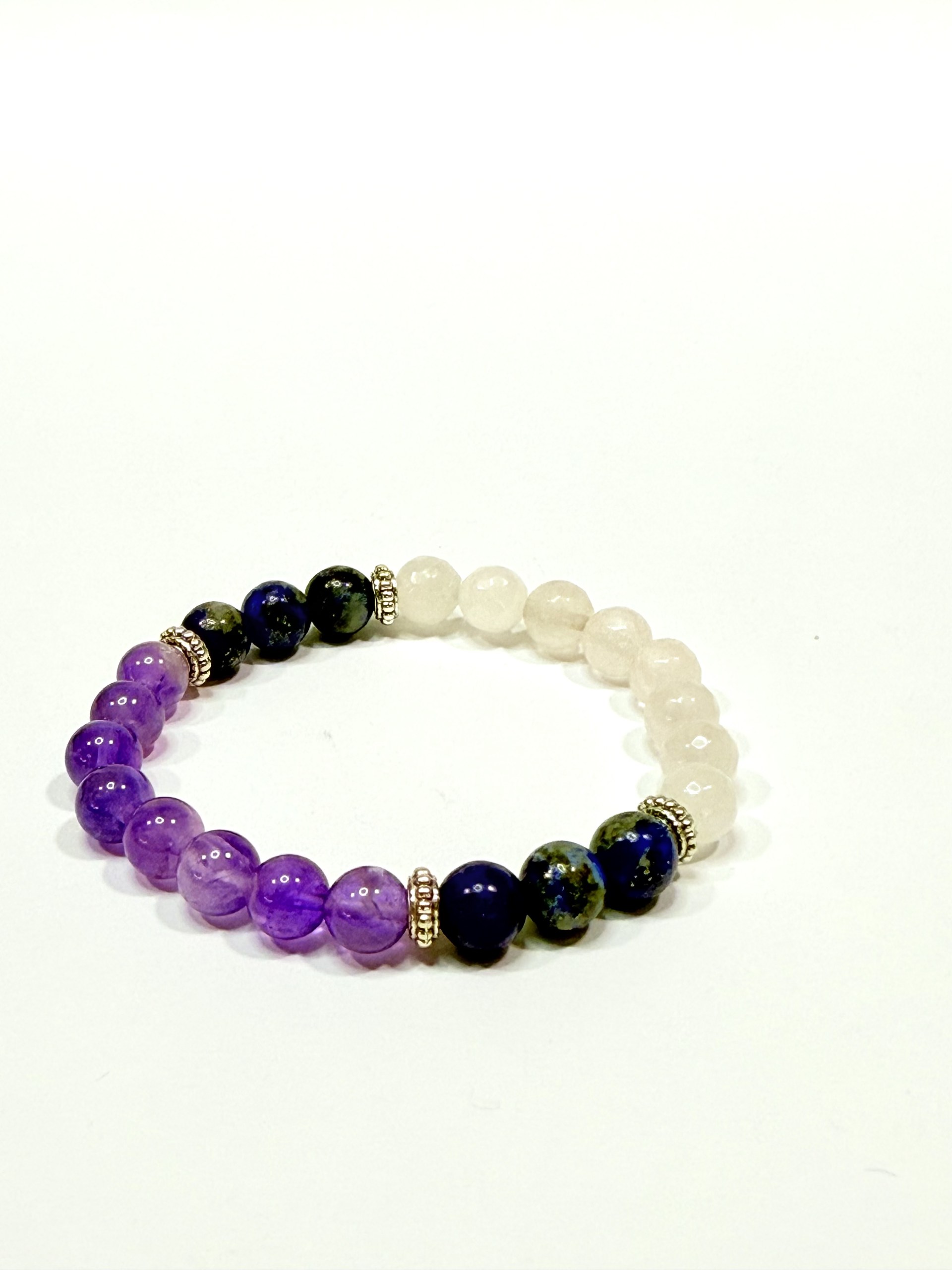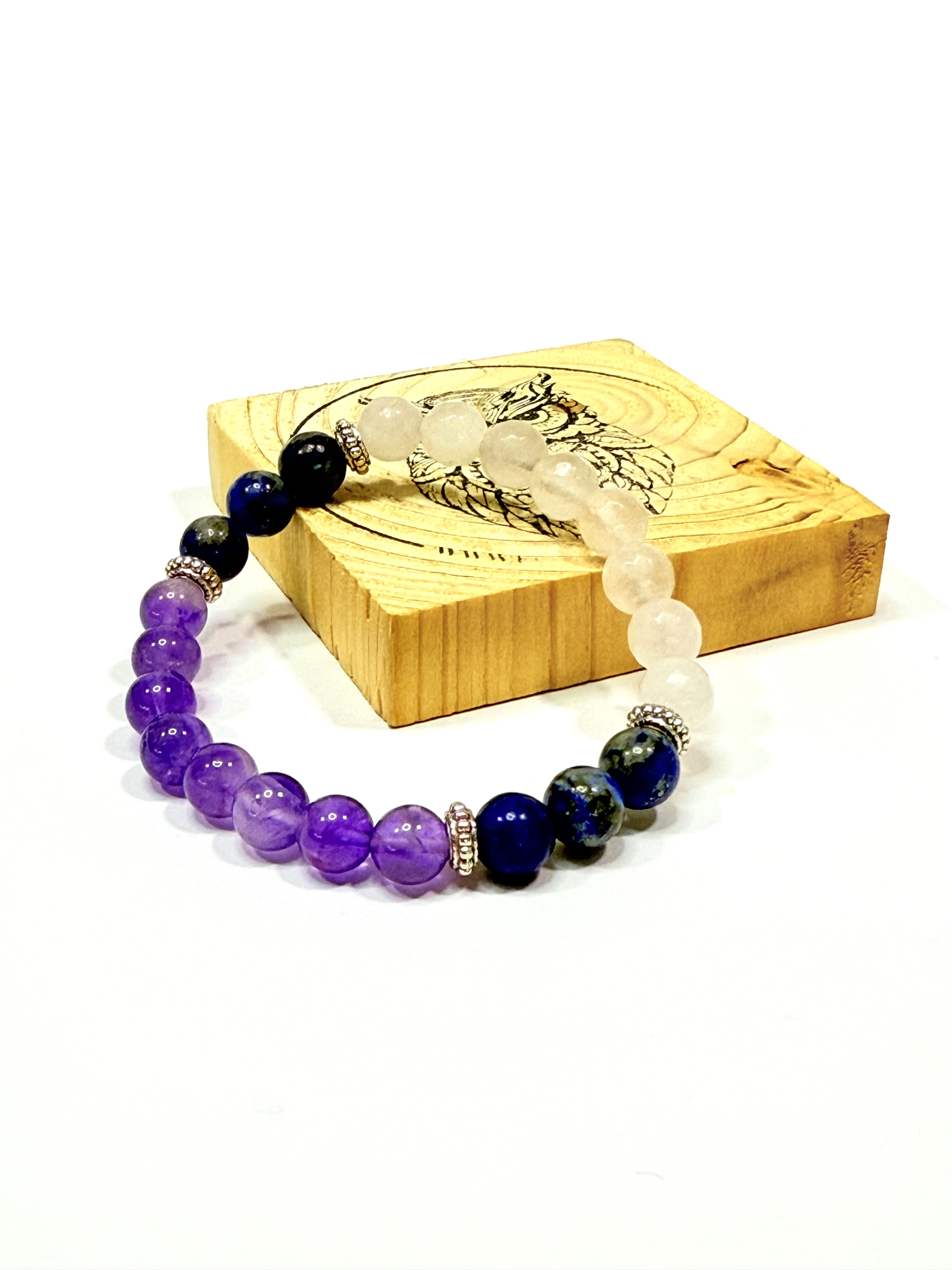 Alivio emocional y claridad interior. El Cuarzo Rosa nutre el corazón, la Amatista libera el estrés, y el Lapis Lazuli ayuda a reconectar con la sabiduría interna y la paz mental.