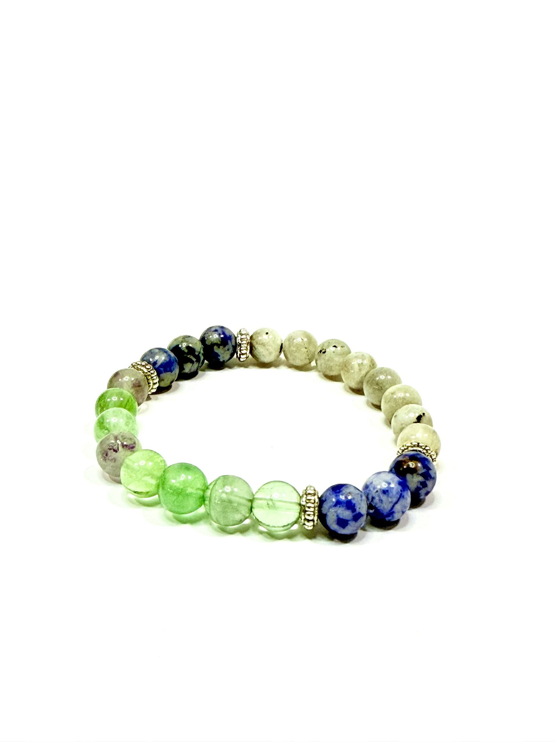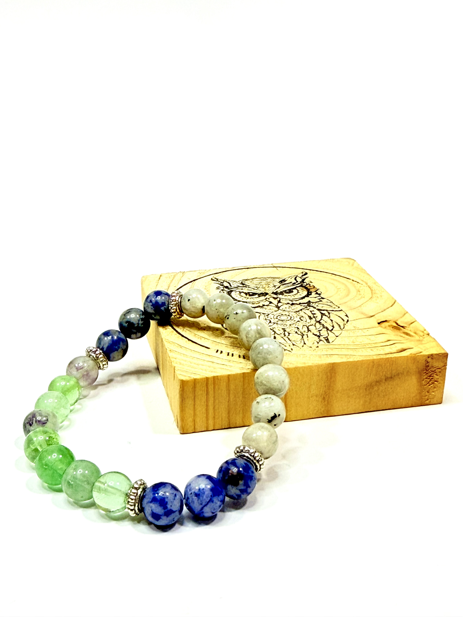 Ideal para concentración, memoria y claridad. La Fluorita organiza la mente, la Sodalita mejora la comprensión lógica, y la Labradorita estimula la mente intuitiva.
