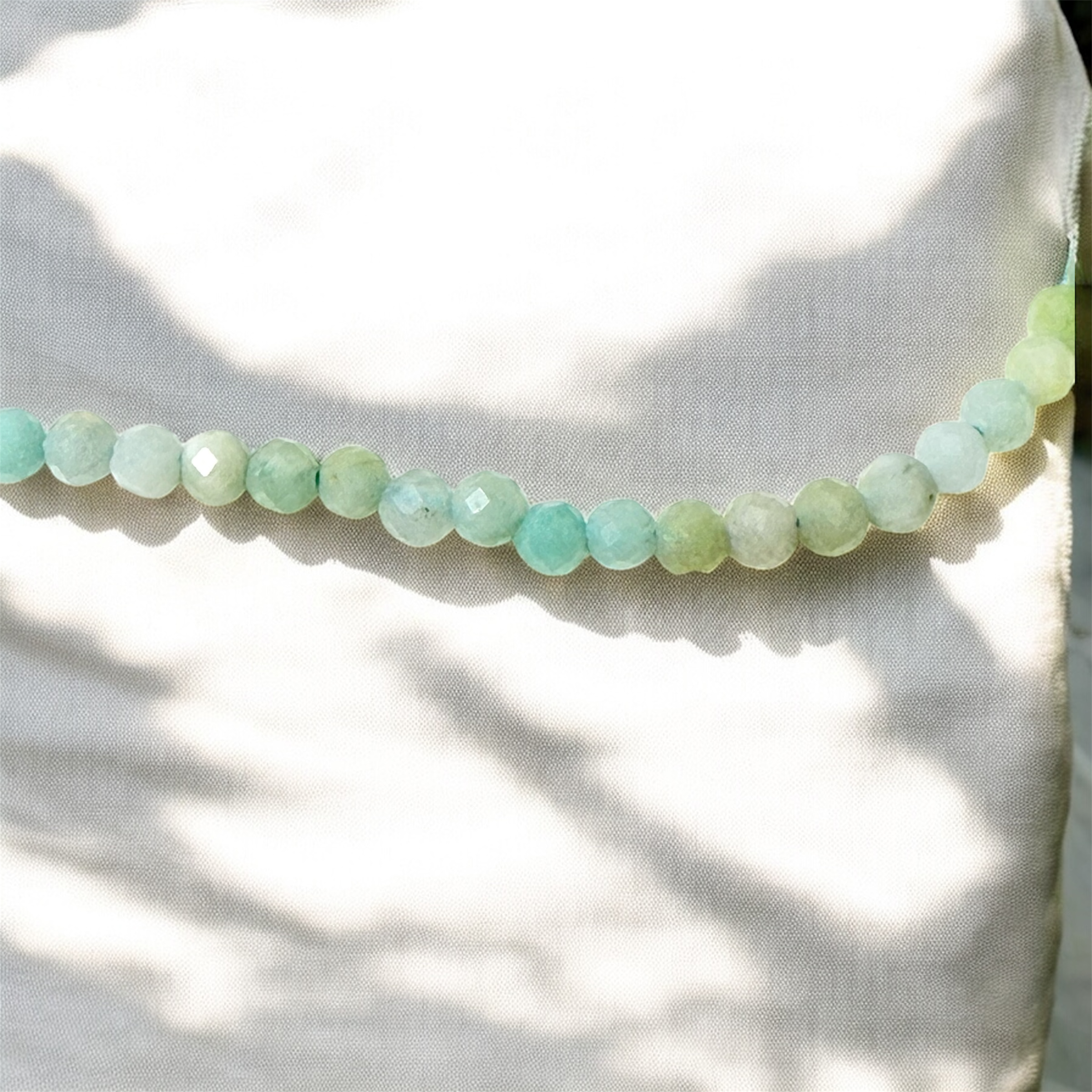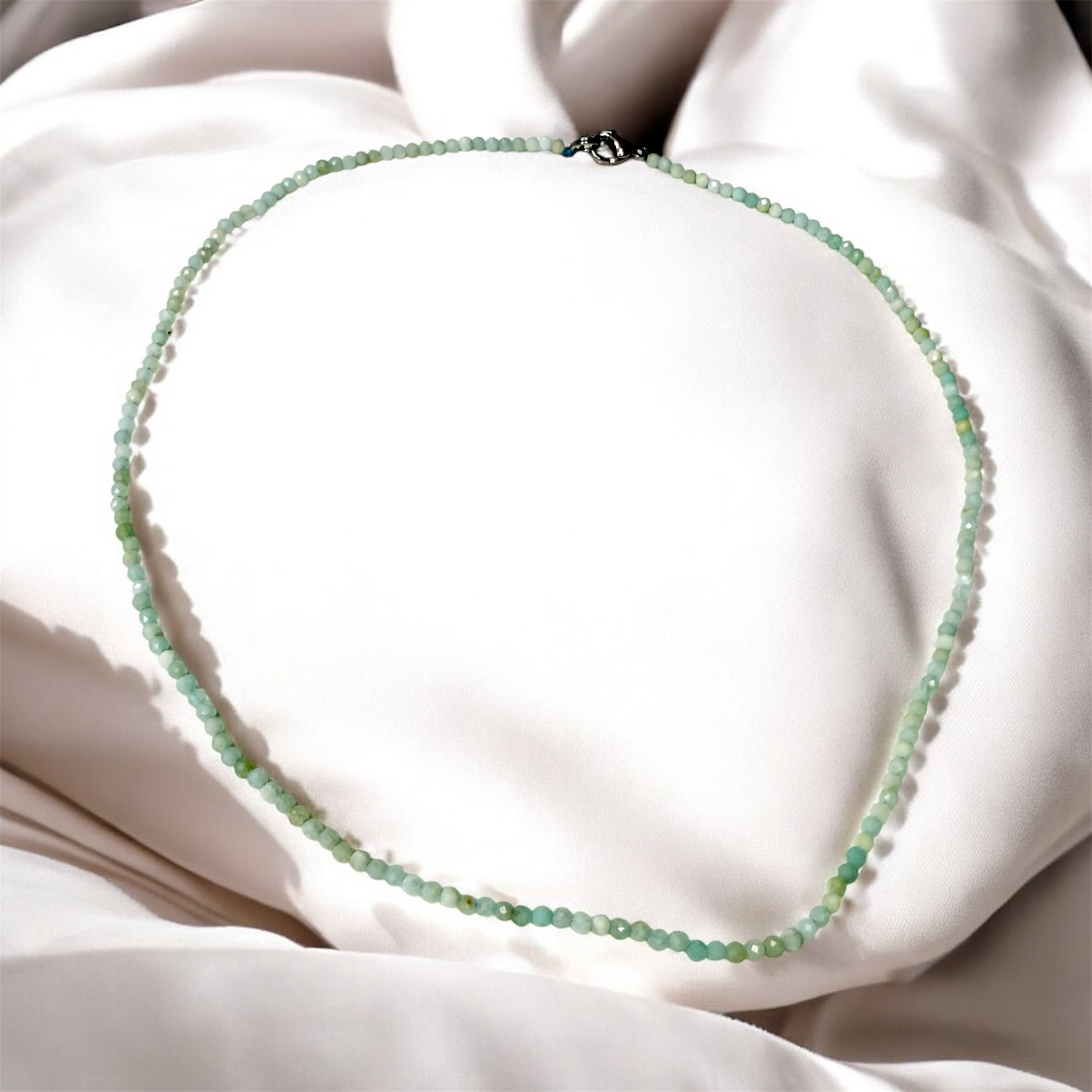 Esta elegante gargantilla está confeccionada con piezas facetadas de amazonita natural de aproximadamente 2 mm, cuidadosamente seleccionadas por su tono verde-azulado característico y su brillo sutil. Con una longitud de 40 cm y diseño no ajustable, ofrece un estilo delicado y contemporáneo que realza la luminosidad natural del cuello.
