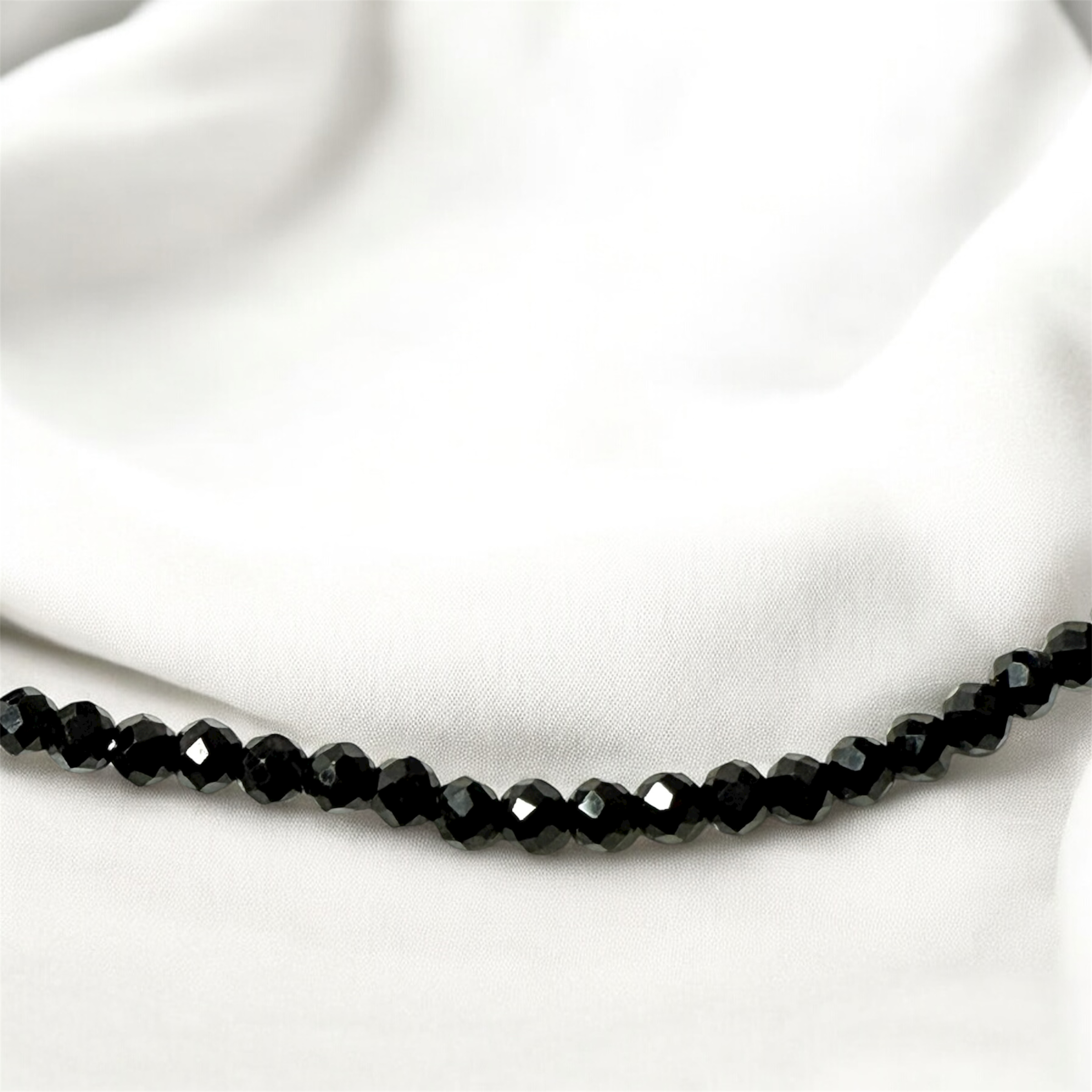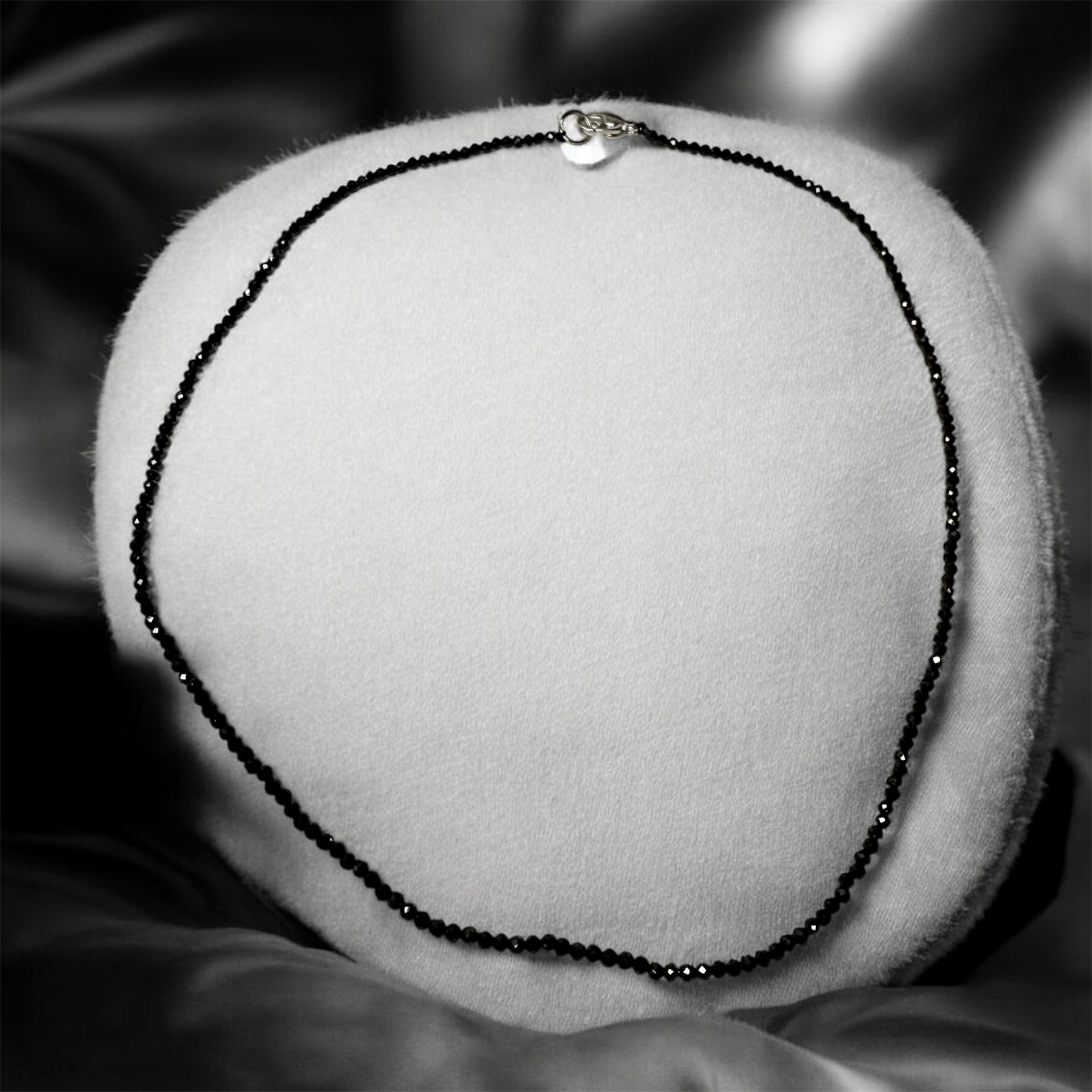 Esta sofisticada gargantilla está elaborada con piezas facetadas de Turmalina Negra natural de aproximadamente 2 mm, cuidadosamente seleccionadas por su color profundo y brillo sutil. Con una longitud de 40 cm y diseño no ajustable, ofrece un accesorio elegante y discreto, ideal para llevar a diario o en ocasiones especiales.