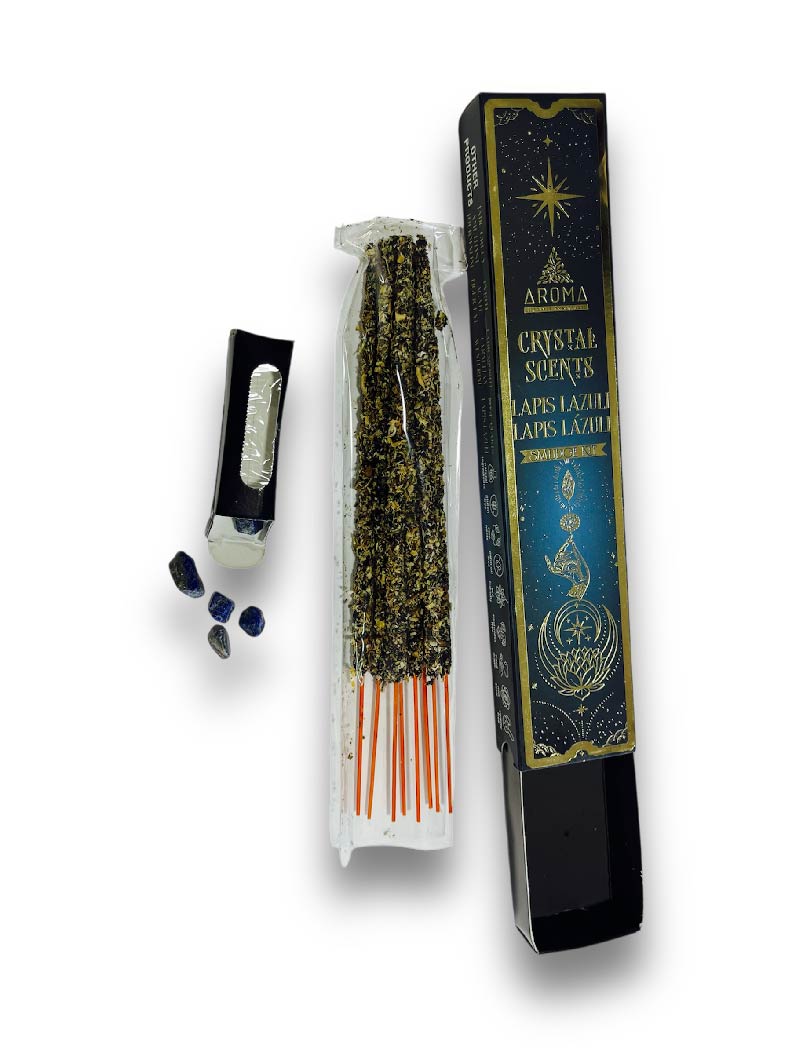 Un toque especial de sabiduría: Cada caja incluye una cajita con pequeños cristales auténticos de Lapislázuli, una piedra preciada desde tiempos antiguos por su capacidad para despertar la mente, potenciar la sabiduría y promover la calma. Utiliza estos cristales junto con el incienso para abrir el tercer ojo, mejorar la comunicación y equilibrar tus emociones mientras te envuelves en un aura de paz y conocimiento profundo.
