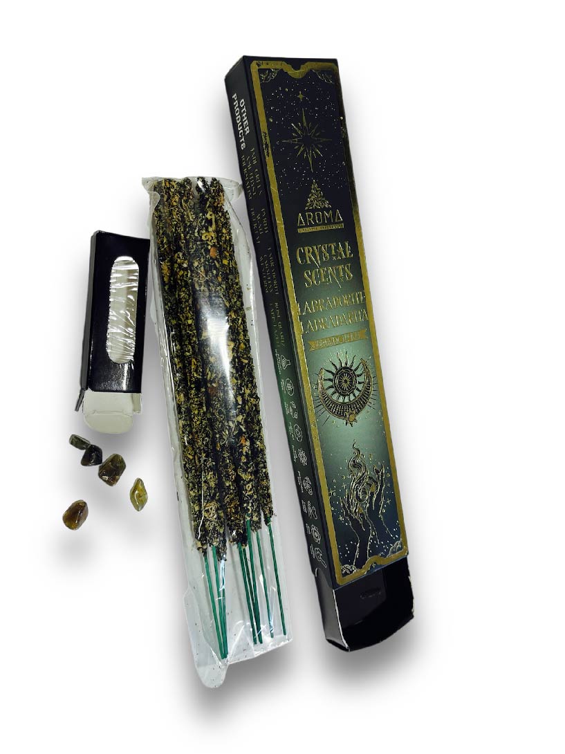 Incluye un toque de magia natural: Cada caja también viene con una cajita de pequeños cristales auténticos de Labradorita, una piedra poderosa conocida por sus propiedades de protección energética y su capacidad para estimular la intuición y la creatividad. Estos cristales, junto con el incienso, forman una combinación ideal para alejar las energías negativas, potenciar la transformación personal y ayudarte a conectar con tu verdadero potencial espiritual.