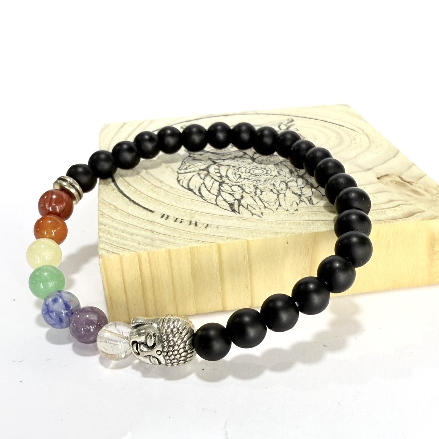 Esta pulsera es un poderoso escudo energético que combina la fuerza protectora de la obsidiana mate con la armonía de las piedras de los 7 chakras. La obsidiana es una piedra de gran poder que absorbe las energías negativas, disuelve bloqueos y aporta claridad mental. Las piedras de los chakras equilibran el flujo energético, promoviendo bienestar en todos los niveles. La cabeza de Buda simboliza la iluminación, la paz interior y la conexión con la sabiduría espiritual.