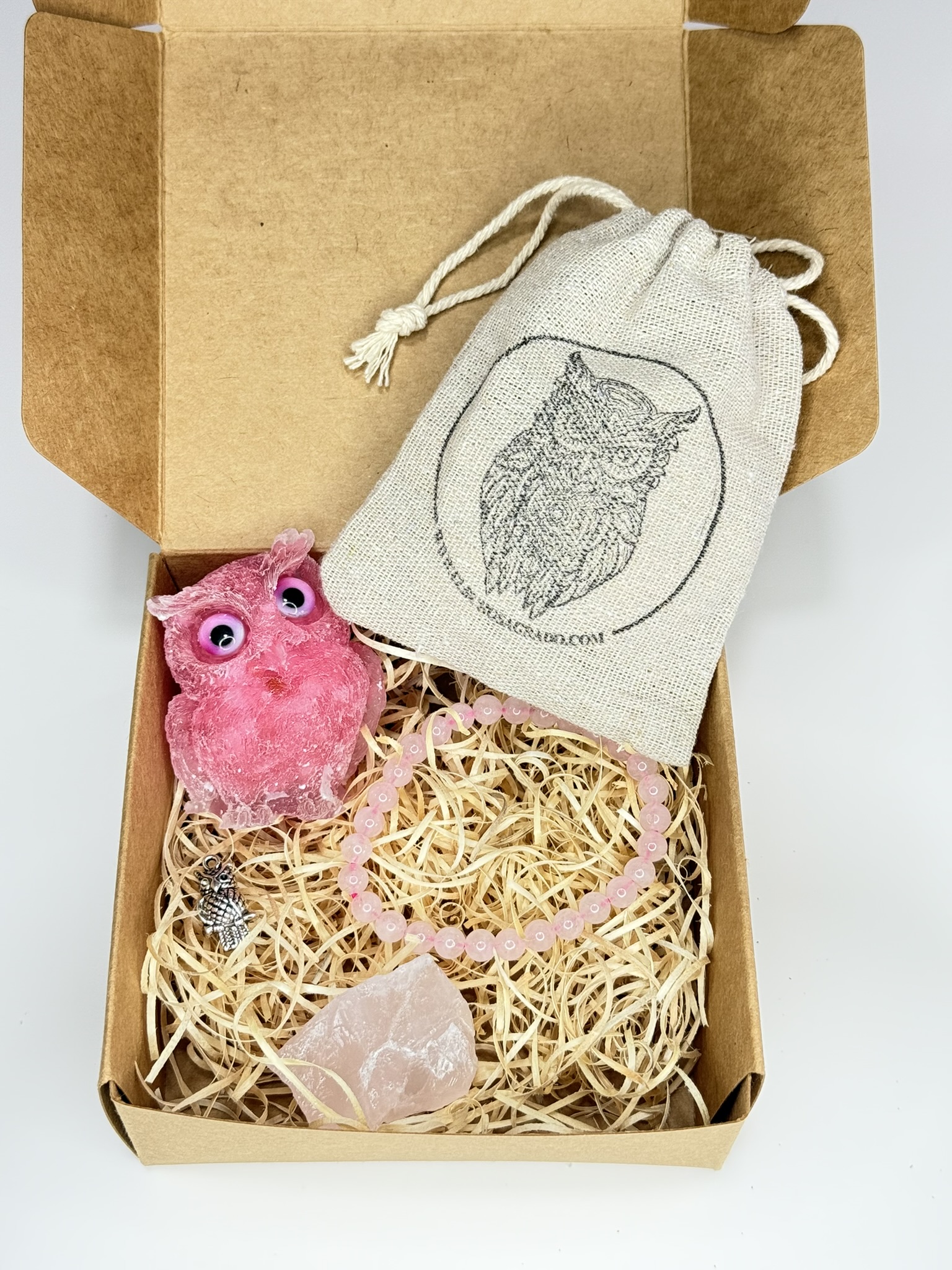 1 búho decorativo con fragmentos de cuarzo rosa en su interior: símbolo de sabiduría y protección emocional, ideal para armonizar cualquier espacio.